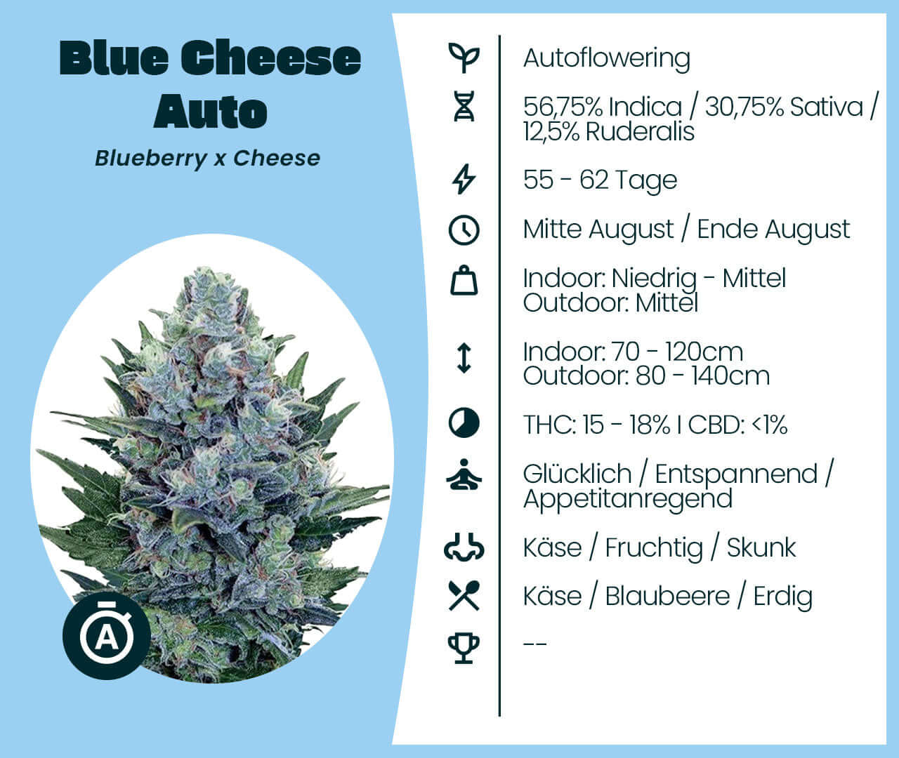 Unsere Blue Cheese Auto Cannabis Samen wachsen zu einer kompakten, aber äußerst kraftvollen Autoflower heran. Blue Cheese Auto entstand durch die Kreuzung von Blueberry und Cheese und vereint die fruchtig-süßen Aromen der einen mit den aromatisch-würzigen Noten der anderen. Mit einem genetischen Mix aus 56,75 % Indica, 30,75 % Sativa und 12,5 % Ruderalis sorgt diese Sorte für eine perfekt ausbalancierte Wirkung und überzeugt mit einer kurzen Lebensdauer von 55–62 Tagen – ideal für schnelle, diskrete Grows.