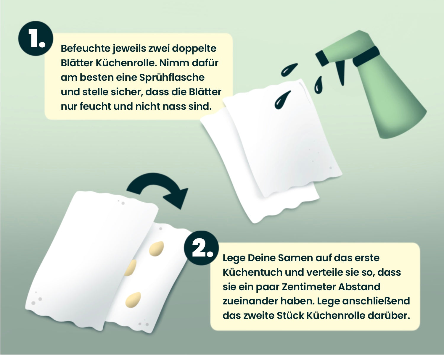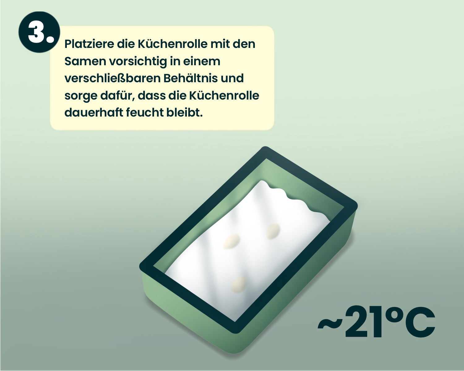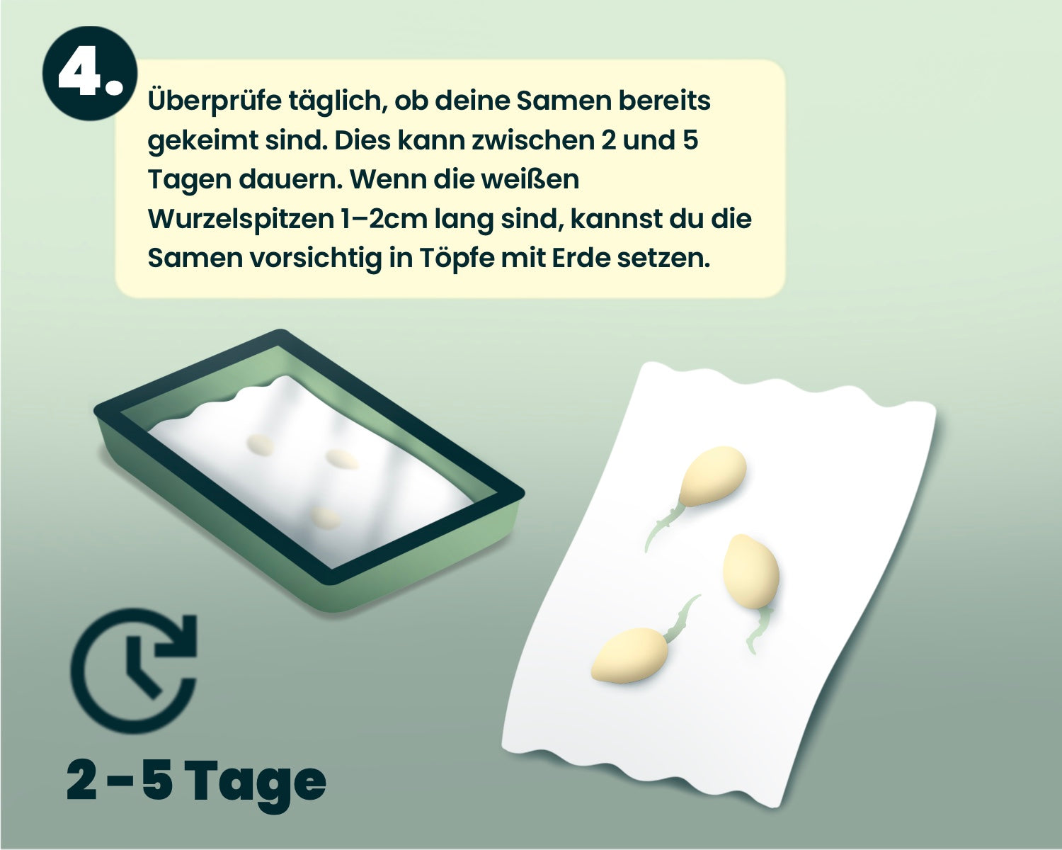 Ich mache das schon ein bissel länger, aber in letzter Zeit keimen sie zwar also der Samen öffnet sich und es kommt eine 1 Millimeter lange weisser Punkt und dann passiert nichts mehr. Habe sie nach drei Tagen des nichts passierend in die Erde gepackt. Sieben Tage später nicht gekommen.